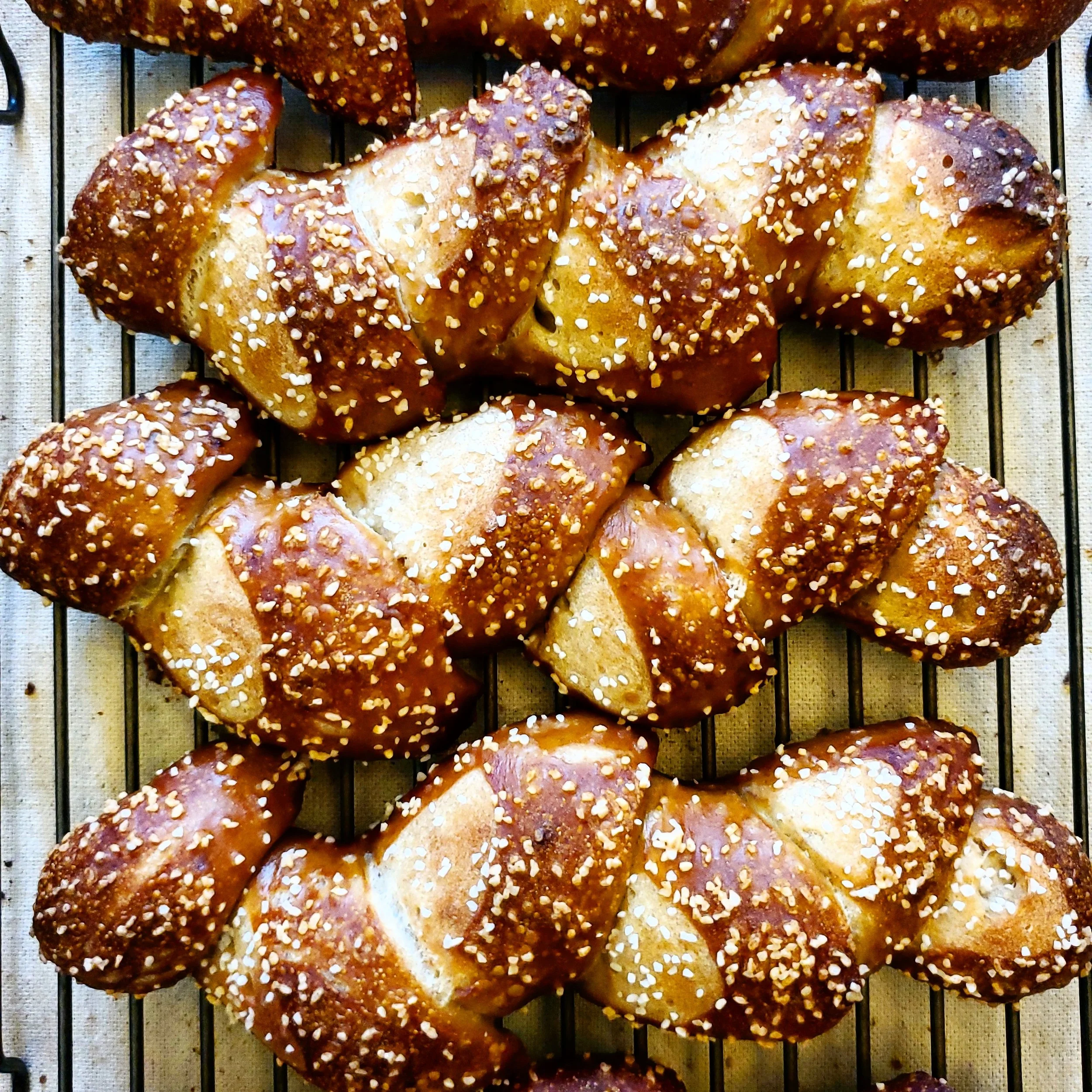 In March of 1980 I received a National Geographic World magazine for kids with an article about baking soft Pretzels. I fell in Love with Soft Pretzels way back when. While I lived in the US Virgin Islands I taught myself to bake NY Water Bagels simply out of need. The two have now been effectively crossed into my Hybrid Pretzagel. Flour, Water, Brown Sugar, Amber Barley Malt Extract, & Levain