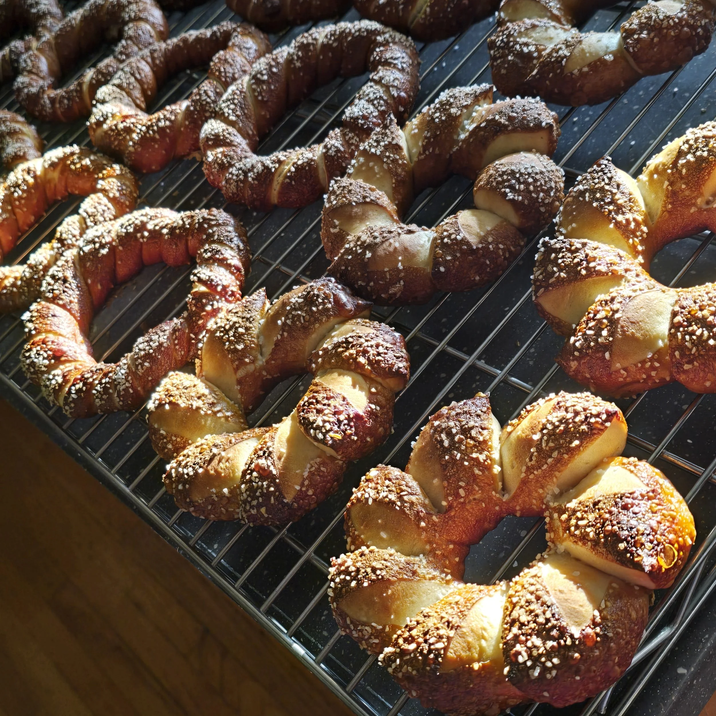 In March of 1980 I received a National Geographic World magazine for kids with an article about baking soft Pretzels. I fell in Love with Soft Pretzels way back when. While I lived in the US Virgin Islands I taught myself to bake NY Water Bagels simply out of need. The two have now been effectively crossed into my Hybrid Pretzagel. Flour, Water, Brown Sugar, Amber Barley Malt Extract, & Levain